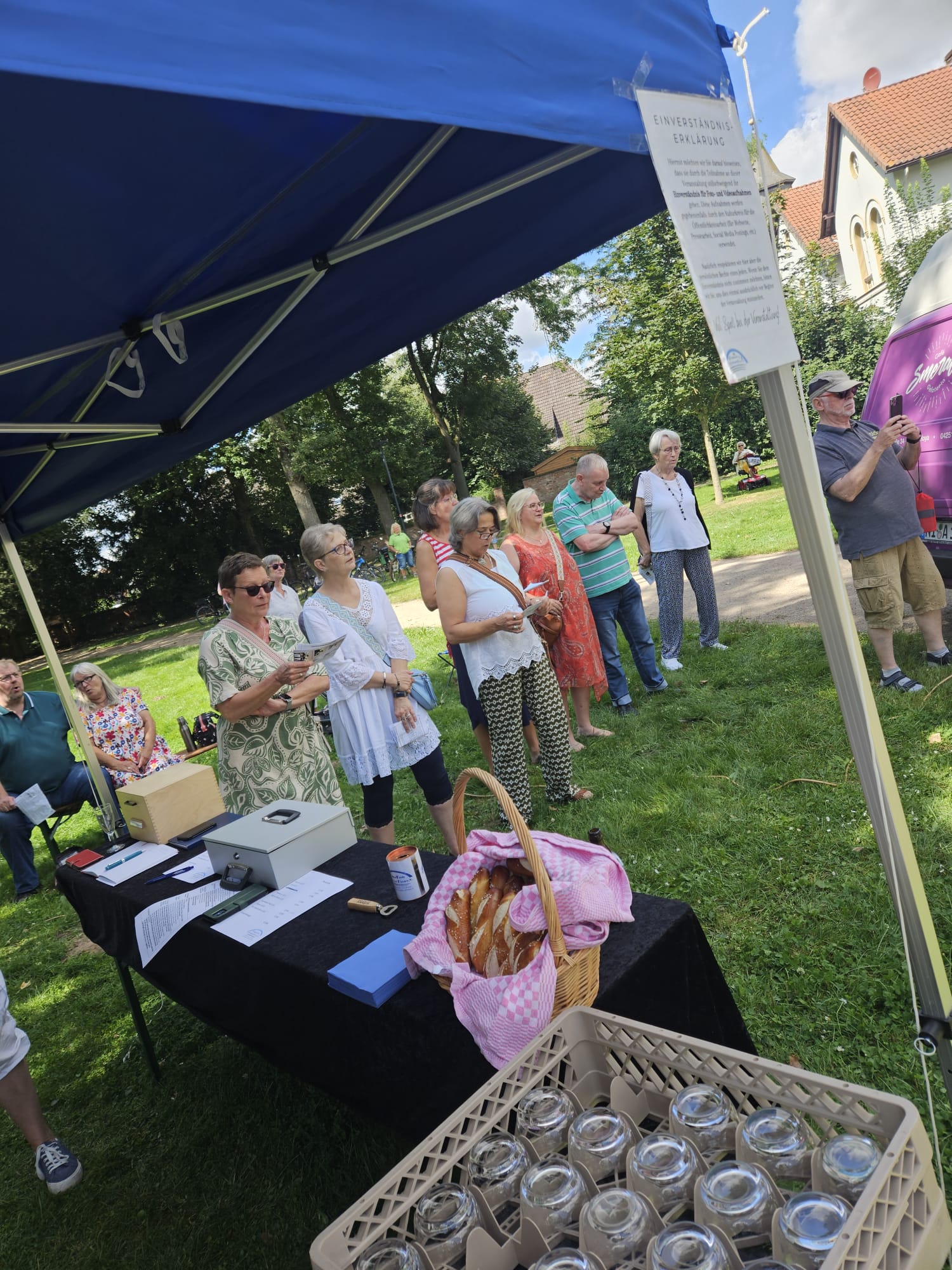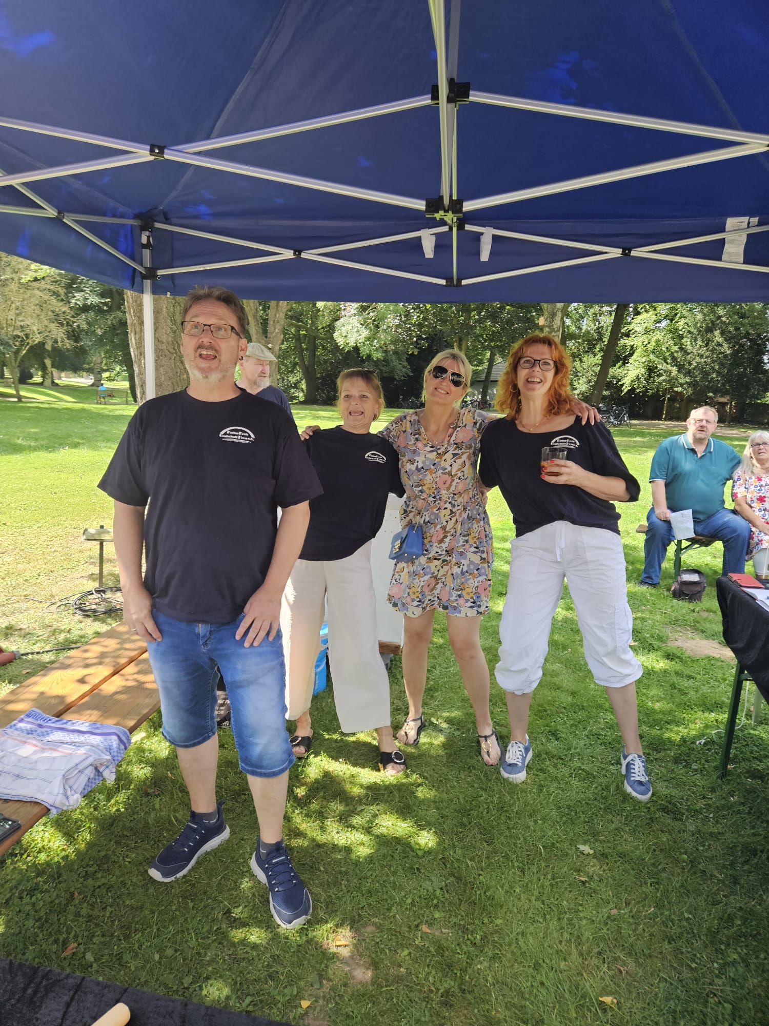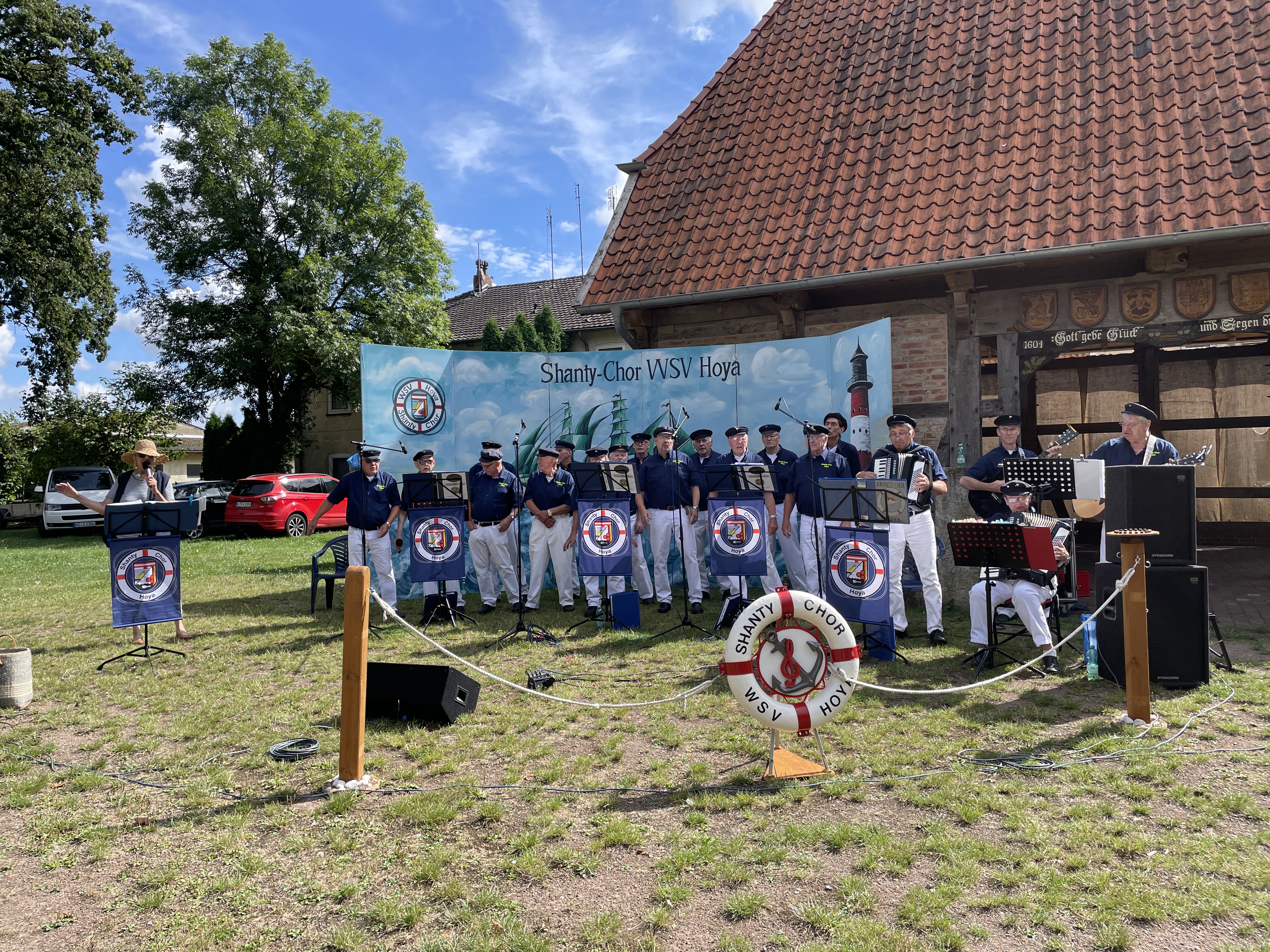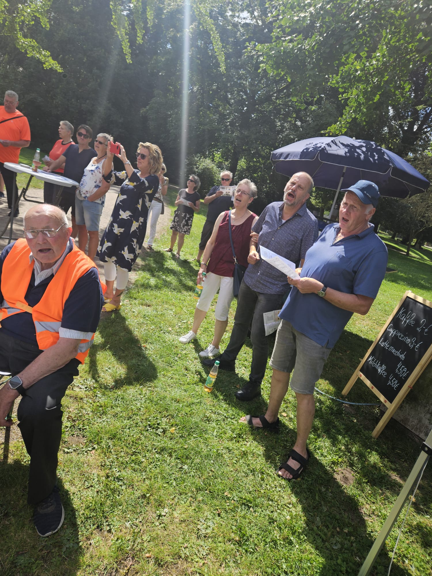 Ungefähr 80 Besucher waren am Sonntagvormittag der Einladung des Shanty-Chores unter der Leitung von Monika Stollmann gefolgt und bei herrlich sommerlichem Wetter zum Gemeinschaftssingen in den Bürgerpark gezogen. So entstand dort für anderthalb Stunden ein stimmkräftiger gemischter Chor.